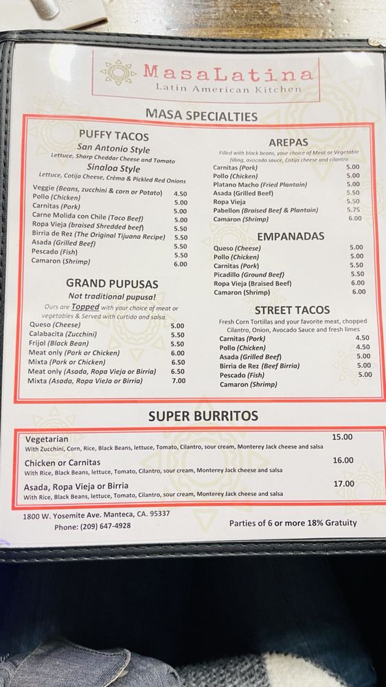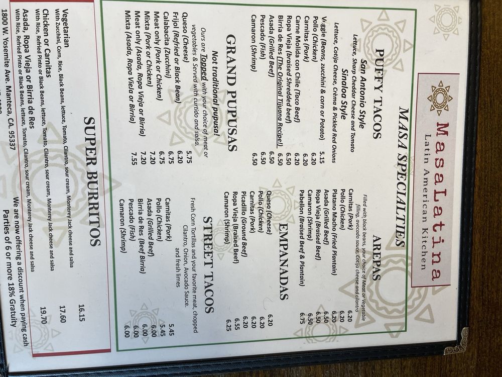 MasaLatina Latin American Kitchen, a Salvadoran-Mexican restaurant in Manteca, CA, offers a diverse menu catering to various dietary preferences like pescatarian, vegan, and vegetarian options. This Latinx-owned establishment provides an array of services including delivery, takeout, catering, and wheelchair accessibility. Customers rave about the flavorful dishes like empanadas, pupusas, puffy tacos, platanos, and frijoles. The ambiance is clean and inviting, with the option for outdoor seating and gender-neutral restrooms. Many patrons appreciate the generous portion sizes and friendly service, making it a local gem worth visiting. Special touches like tajin on the rim of cocktails and unique taco styles add to the dining experience. If you're in the Central Valley, MasaLatina Latin American Kitchen is a must-visit for delicious Latin cuisine.